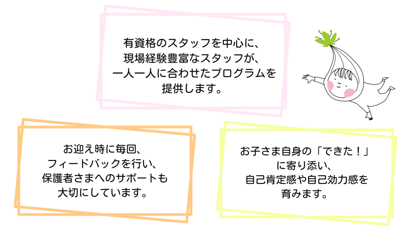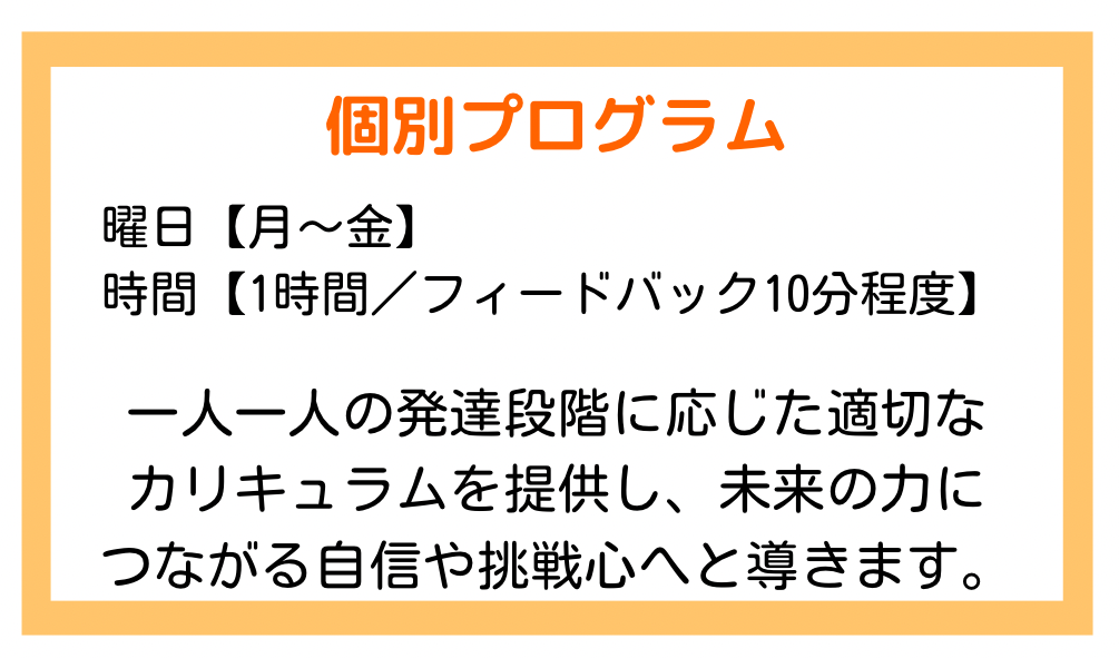 一人一人の発達段階に応じた適切なカリキュラムを提供し、「できた!」を増やすことで自己肯定感を高め、未来につながる力、自信や挑戦心を導きます。