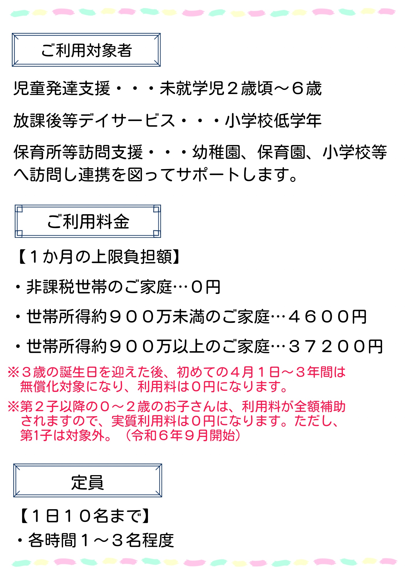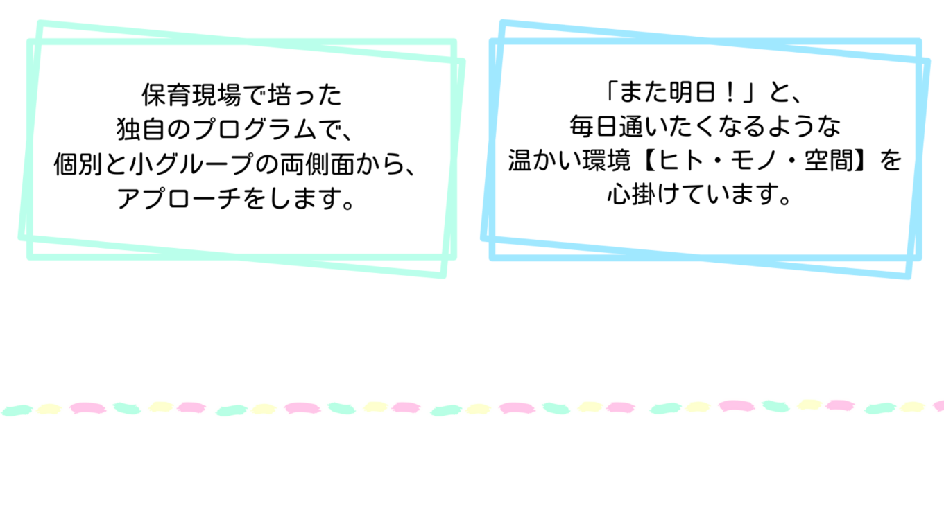※現在、児童発達支援・放課後等共に満席となっており、すぐにご見学の案内が難しい場合がございます。